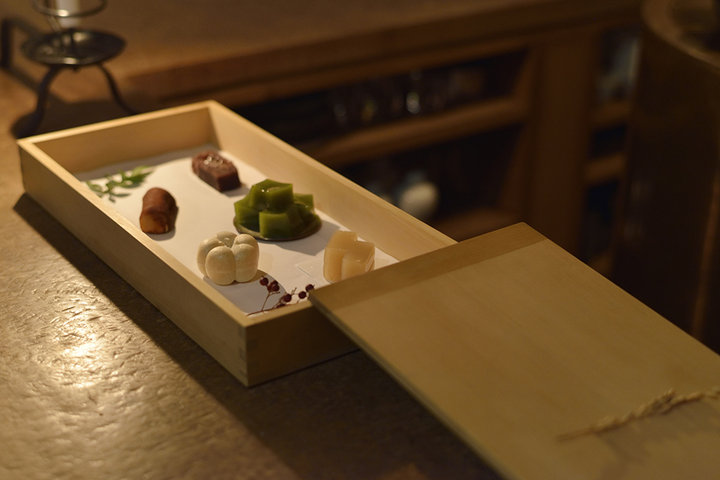 お茶には必ずお茶菓子がつく。桐箱に並ぶ季節の菓子の中から、好みのものを選ぶスタイルだ。