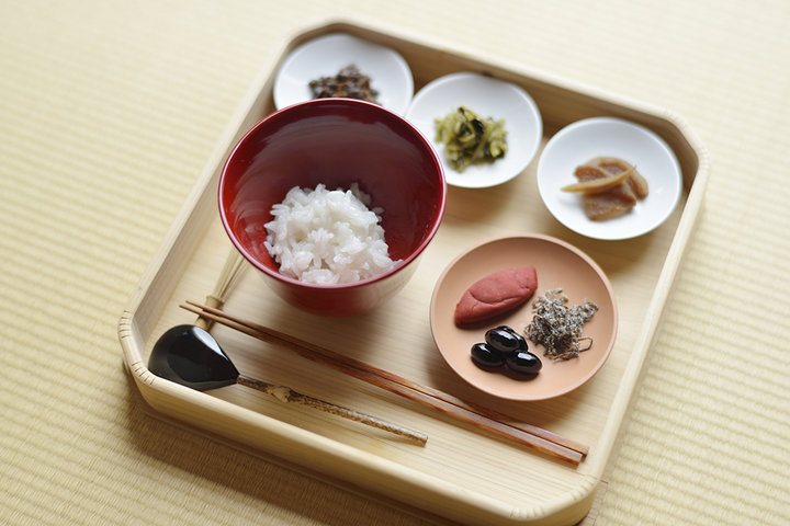 「粥茶のコース」は要予約。食前のお茶と料理二品に続き、炊き加減の異なる粥を段階的に供する。佃煮や漬物、梅干しなどの粥のともを添えて。