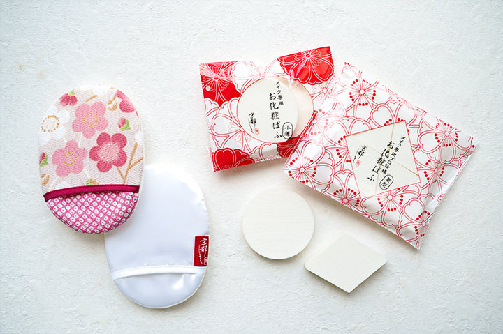 絹織物業がさかんな京都。「京都しるく」では絹を使った美容雑貨やシルク成分配合のスキンケアが揃います。 絹の切布で肌を磨くという花街の美肌術からヒントを得た「洗顔パフ」は20年を超えるロングセラー。洗顔時にパフでふき取ると、余分な角質が取れつるんとした舞妓肌に。ちりめん柄は十数種類揃うので、自分のお気に入りが見つかります。 ファンデーションが薄づきかつ肌にフィットすると評判の「お化粧パフ」。天然ゴムラテックス仕様でもっちりとした弾力が特徴、小薄、菱形など使いやすい厚さや形が見つかります。