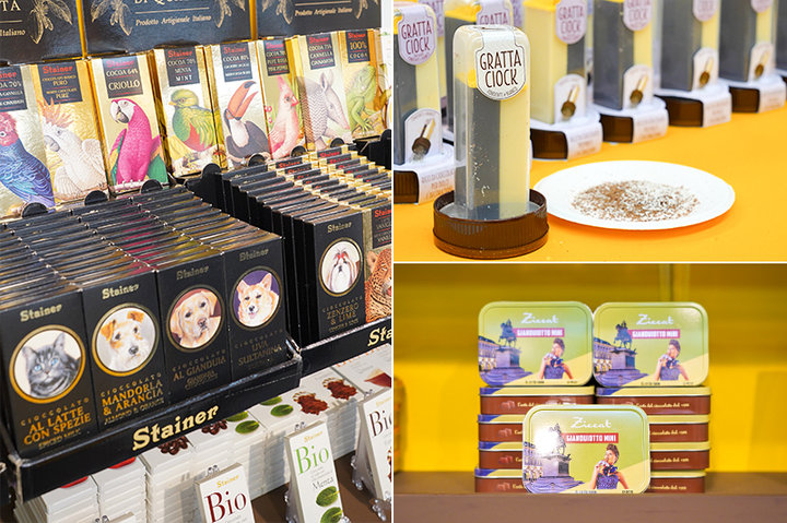 左:「スタイナー」の「タブレットチョコレート」(各種1101円)右上:「コストゥルットーリ・ディ・ドルチェッツェ」の「チョコレートミル(1個160g)」(1801円~)など