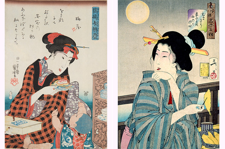 【左】縞揃女弁慶松の鮨歌川国芳、味の素食の文化センター蔵、通期【右】風俗三十二相むまさう嘉永年間女郎之風俗月岡芳年、味の素食の文化センター蔵、通期
