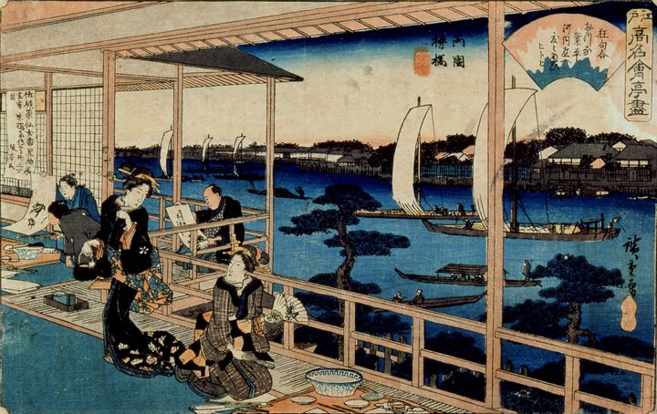江戸高名會亭盡(えどこうめいかいせきづくし)両国柳橋河内屋歌川広重、味の素食の文化センター蔵、通期