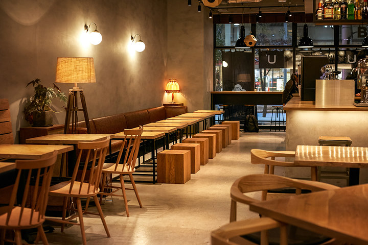2018年青森市の中心街にオープンしたカフェレストラン『UGUISU』には、テーブルや椅子、スツールを納品。直線と曲線のコントラストが美しい。