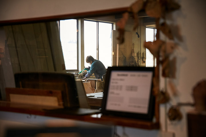 ショップ部分の小窓からは、併設する工房の様子が伺える。「現場を見てもらうことで、自分の家具に愛着を持ってもらいたい」と佐藤氏。