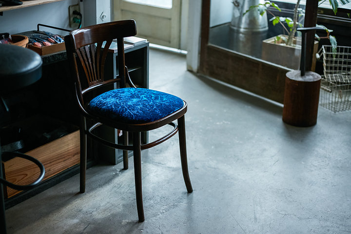 座面の生地を張り替えたヴィンテージの椅子は、創業当初からの人気アイテム。生地の張替えのオーダーも多く受注する。