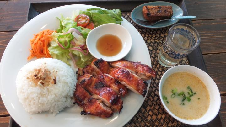 今回のランチはガイヤーンプレート。“ガイヤーン”はタイ北部の料理で、スパイスをきかせたジューシーなチキンの味わいと、パリッと焼き上げられた皮の食感です。ご飯にもよく合い、お箸も進みます。 ワールドプレートには、手作りの食前ドリンク、スープ、ひとくちデザートが添えられています。この日は、程良い甘さの手作りレモンジンジャーと豆乳のスープ、熟成フルーツケーキがセットに。これだけのボリュームで1,080円とは嬉しいですね。