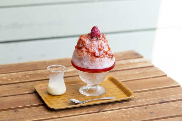 「埜庵」のかき氷は、日光「三ツ星氷室」の天然氷、自家製のシロップ、フルーツなど、素材それぞれの味を活かしつつ、絶妙に調和するように組み合わせて作られています。ふわふわの削り氷はキンキンに冷えすぎず、軽い口当たり。1人で2杯食べる人がいるというのも納得です。 お店の一番人気の味は「いちごみるく」。いちごは契約農家で栽培されたものを使っています。