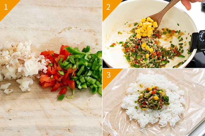 【作り方】 1:れんこん、パプリカ、ピーマンは5mm角に切る 2:鍋に★を入れて一度煮立たせた後、1とコーンを入れて弱火で約5分煮る。その後、火を止めて粗熱を取る 3:ラップにごはん(1/2量)を薄く広げ、汁気を切った具材を真ん中にのせる。茶巾のように絞っておむすびを作る (ごはんさんより) 「具材を出来るだけ細かく切ると、ごはんに包む時にポロポロとこぼれず上手く握ることができます。汁気を切らないとごはんに色が染みてしまうので、注意して下さいね」