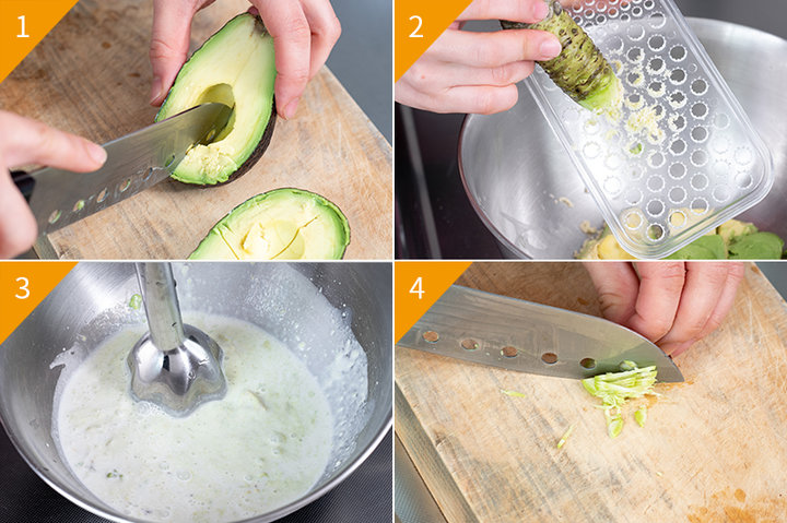 【作り方】 1:アボカドは皮をむいて種を取り、一口大にカットする 2:わさびは皮をむいてすりおろす 3:ボウルに全ての材料を入れて、ハンドミキサーでかくはんし、なめらかなスープ状にする 4:冷蔵庫で30分以上冷やした後、スープの上に千切りにしたわさびを少々添える (ごはんさんより) 「わさびは空気を含ませるようにやさしくすり下ろすのがコツ。辛みと香りがさらに豊かになりますよ。ぜひ試してみてください」