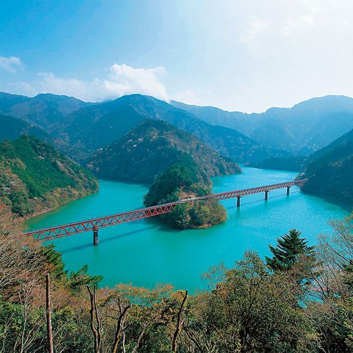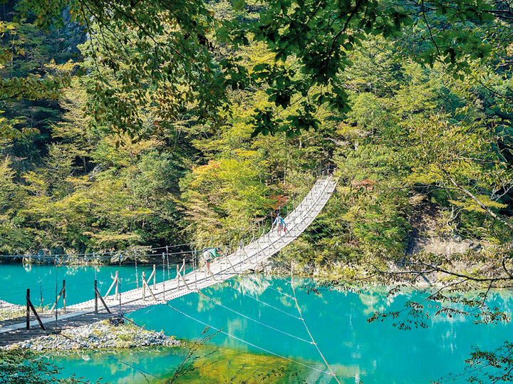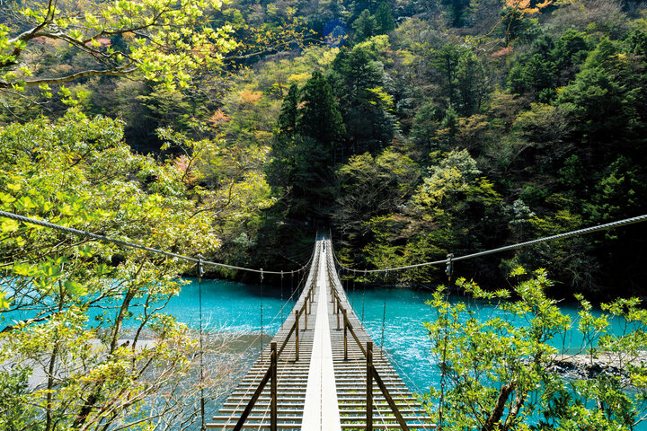 千頭駅から路線バスで北へ、次第に深まっていく渓谷美を眺めながら40分ほどで、寸又峡温泉という小さな温泉地にたどり着きます。温泉街を抜けて遊歩道を進んだ先にはまるで絵画の世界のような光景が広がります。 ターコイズブルーに輝く湖の湖上に掛かるのは、「夢の吊橋」。吊り橋の長さは90メートル、湖面からの高さは約8メートル。大自然の神秘を感じながら、スリル満点の空中散歩を体験しましょう。