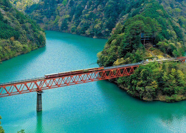 静岡県中部を流れる大井川周辺は、良質な源泉のある温泉地としても知られるエリア。ローカル線の車窓の向こうには一面の茶畑と山々、雄大な大井川に彩られた田園風景と、橋のある絶景に出会えます。 湖上の線路の隣に設置された遊歩道や、スリル満点の吊り橋を渡ったり、世界一長い木造歩道橋など、バラエティ豊かな橋のある風景と温泉を合わせた旅は、リラックスして過ごすのにぴったりですよ。