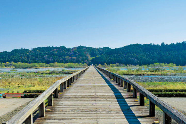 大井川中流域に位置する島田市は、島田、金谷、川根地区の茶産地を擁する、銘茶のふるさと。JR島田駅から南東に向かって徒歩20分、大井川にかかる全長897.4メートルの蓬莱橋は、ギネスブックに認定された世界最長の木造の歩道橋として知られています。 もともとは、大井川右岸に広がる牧之原台地の開墾を安全に進めるため1879(明治12)年に建造された蓬莱橋。左岸のたもとにある「蓬莱橋897.4茶屋」では、島田市緑茶化計画で開発された名産品も購入できます。