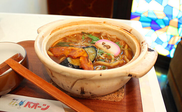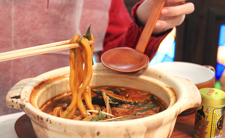 1店舗目のカフェ『ぞうめし屋』以降、どの店舗でも提供されている「味噌煮込みうどん」は、赤味噌、白味噌、カレー、トマトの4種類から選べます。稲吉さんのおすすめは「赤味噌」だそう。今回は、揚げ野菜をトッピングしました!