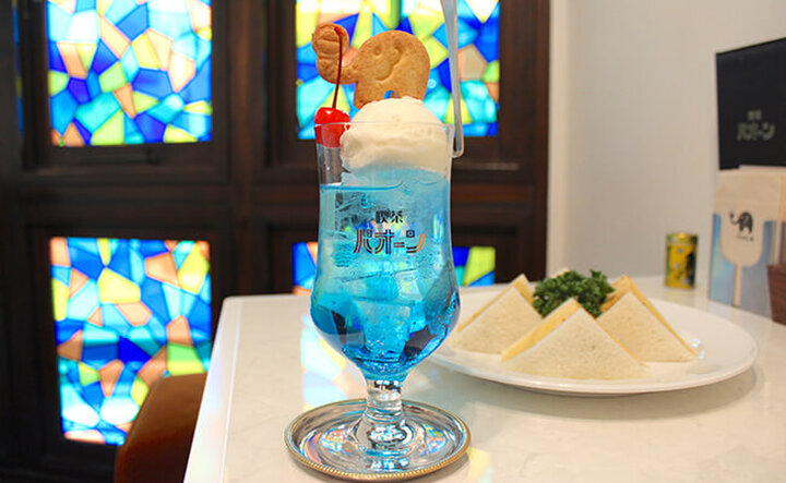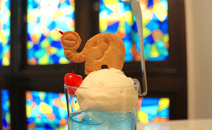 喫茶店の定番ドリンク「クリームソーダ」には、『ぞうめし屋』オリジナルのぞうのクッキーがちょこんとのって登場。もともとこのクッキーはパフェメニューにのみのせていたそうですが、お客さんから「クリームソーダにものせて欲しい」というリクエストがあり、「クッキーあり・なし」が選べるように。