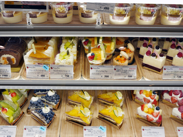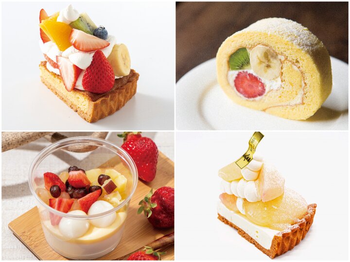 ショーケースに並ぶ15~20種類のカットケーキは、テイクアウトでもイートインでも楽しめます。定番の「いろいろタルト」(左上・700円/税別)や「市場ロール」(右上・カット420円/税別)をはじめ、どれもフルーツがたっぷり使われているのが特徴です。 旬のおいしさを大切にしているので、商品は季節ごとに変化して訪れるたびに新鮮。夏はモモやメロンのケーキやタルトがおすすめだそうです。また、マレーシア発のココナッツ風味のユニークなブランマンジェ「モーモーチャーチャー」(左下・480円/税別)など、新商品もお見逃しなく。