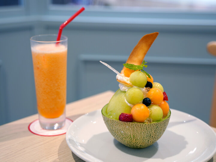 フルーツ自慢のお店だけに、パフェは季節限定を含めて数種類用意しています。毎年、5月上旬〜8月上旬ごろに登場の「メロンパフェ」は、マスクメロンを器にしたゴージャスな逸品。上品な甘みがジュワッと滴ります。メロンは青肉と赤肉を合わせて、小ぶり1個弱ほど惜しみなく盛り込んでいるとか。 長く印象的なラングドシャや夏らしい透明なジュレほか、中には北海道産生クリームやカスタードクリーム、しっとりふわふわのスポンジも入って、メロンのおいしさを引き立てています。