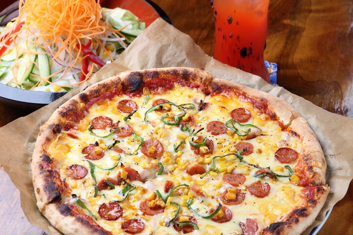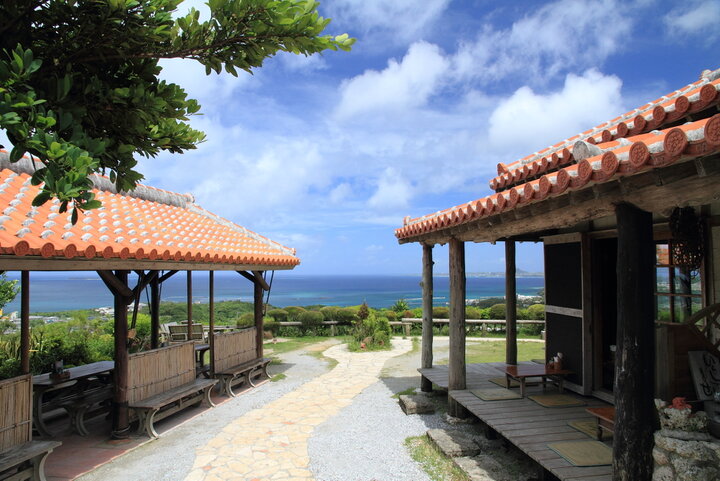 本部町の丘に建つ、赤瓦屋根の古民家風カフェ。空と海の大パノラマが一望できるほか、日が沈むころの夕景も美しいと評判です。厚めの生地に具だくさんの自家製ピザがメインで、サラダやドリンクもそろいます。
