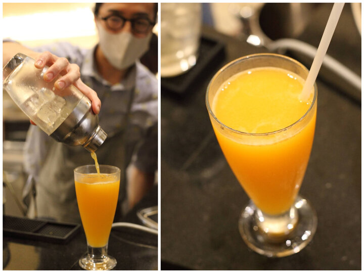 「かつての常連さんから話を聞いたりして、マルイチで作られていた味を再現しました。地元の果物店から厳選したフルーツの味わいをストレートの楽しめるジュースです」という奥岡さん。 店内にシェイカーの音が響くと、暗めの照明なので、まるでバーにいるような感覚に。オレンジやグレープフルーツがあり、ジュースですが、大人も味わいたくなる一品です。