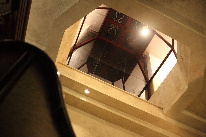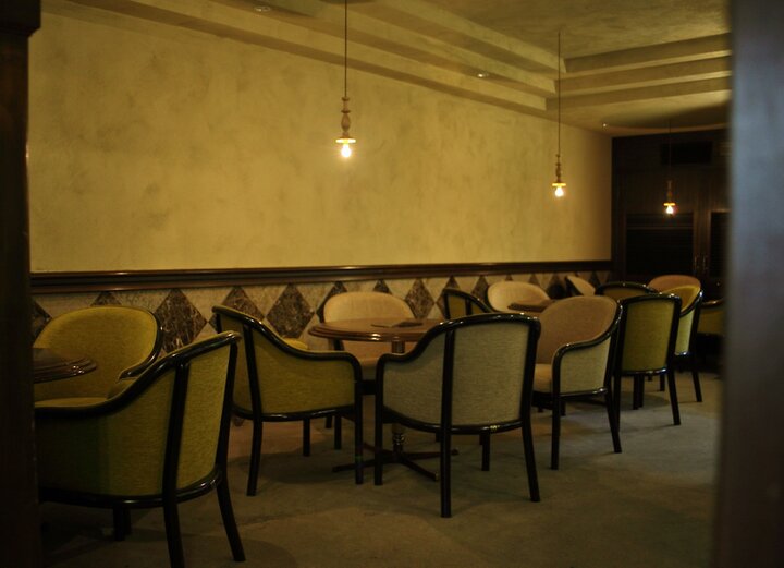 壁を塗り直したり、椅子を張り替えたりした以外はほとんどそのままという店内。エントランスには大理石のオブジェがあり、カウンターには巨大な鏡の装飾。店内中央を見上げると吹き抜けになっていて、アートなセンスを感じさせる意匠があちこちに残っています。豆電球と間接照明だけの店内は、商店街の賑やかさを忘れてしまうほど落ち着いた雰囲気です。
