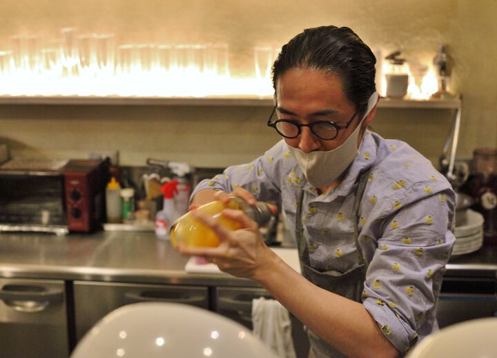 お店の名物は注文を受けてから果汁を絞って作る、フレッシュジュース。まずは「マルイチ」時代にも使われていたというクラシックなジュサーで果汁を絞ります。この果汁をシェイカーでカクテルのように氷と撹拌。シェイカーで冷やすことで果汁が氷で薄まることもなく、フルーツそのものの味わいが楽しめ、しかも酸味がまろやかになるのだとか。