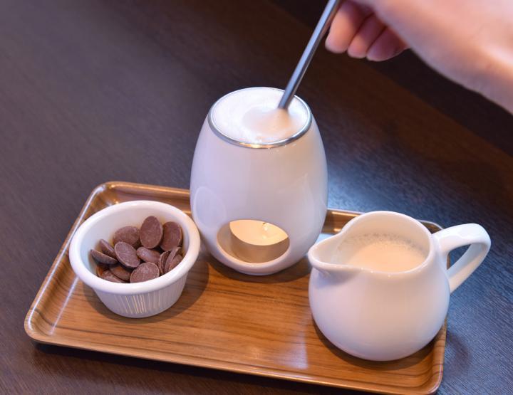 カフェ「Queen’s Collection(クイーンズ・コレクション)」はスイーツからドリンクまで、チョコレートづくし。ここではキャンドルでつくる、自分で選んだチョコレートを好きなだけ溶かしたホットチョコレートが楽しめます。