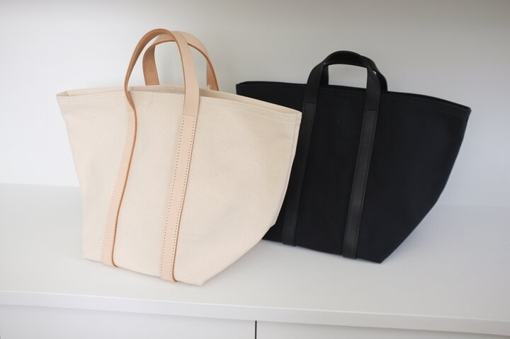 持ち手に革を使った「レザーハンドルニュートート」は、スタイルを格上げしてくれる一品。素材感がダイレクトに伝わる白も、レザー×帆布との異素材ミックスでこなれた感じに。持ち手のヌメ革は、つなぎ合わせることなく贅沢に使用。使い込むほどに、経年変化を楽しめます。