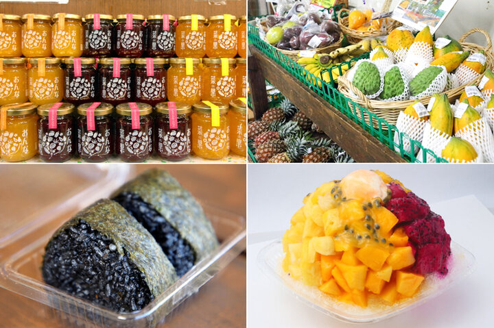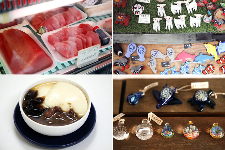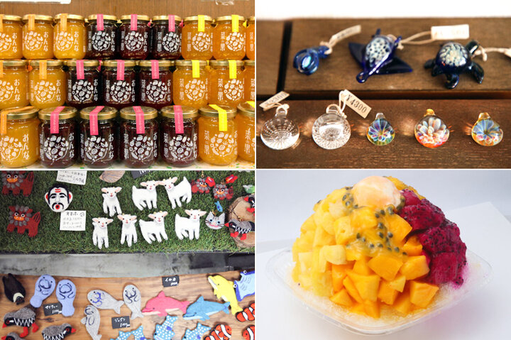 左上:その場で味わえる鮮魚の刺身、右上:島しまかいしゃのフェルトワッペン、右下:キュートなガラスのアクセサリー、左下:沖縄風の台湾スイーツ「豆花」(450円)