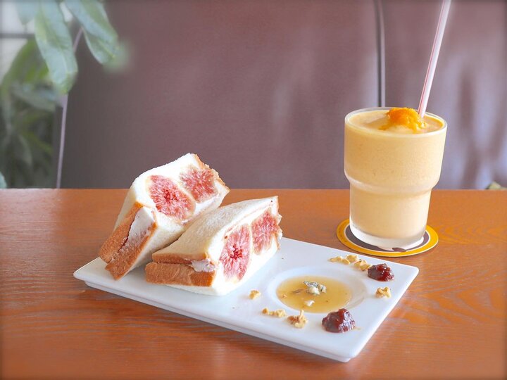 駒沢の閑静な住宅街にひっそりと佇む「アヂト」は、フルーツを使ったオリジナルスイーツが話題の一軒家カフェ。駒沢公園が近いことからペットを連れて来店する人も多く、癒しの人気スポットとなっています。ゴロンと大きなイチヂクが入ったフルーツサンドは、秋までの季節限定。フローズンスタイルのミックスヂュースと一緒にどうぞ。