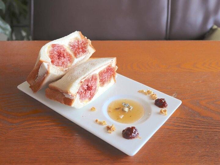 旬の果物をぎゅっと贅沢に挟んだフルーツサンドを目当てに訪れる訪問者も。夏から秋にかけて販売する「大人が恋するイチヂクサンド」が今年も登場しました。パンにはゴロンと大きなイチヂクと、蜂蜜酒ミード入りマスカルポーネチーズクリームに自家製ジャムがたっぷり。一口食べるとイチヂクのジューシーな甘みとチーズクリームの相性が抜群です。別添えのブルーチーズ蜂蜜を付けて食べると、さらに味の変化を楽しめます。 イチヂクは、季節により2個入りまたは4個入りになるのが特徴。2個入りのイチヂクはとろける食感、4個入りのイチヂクは濃厚な甘さ。それぞれ違う味を堪能してみてはいかが。