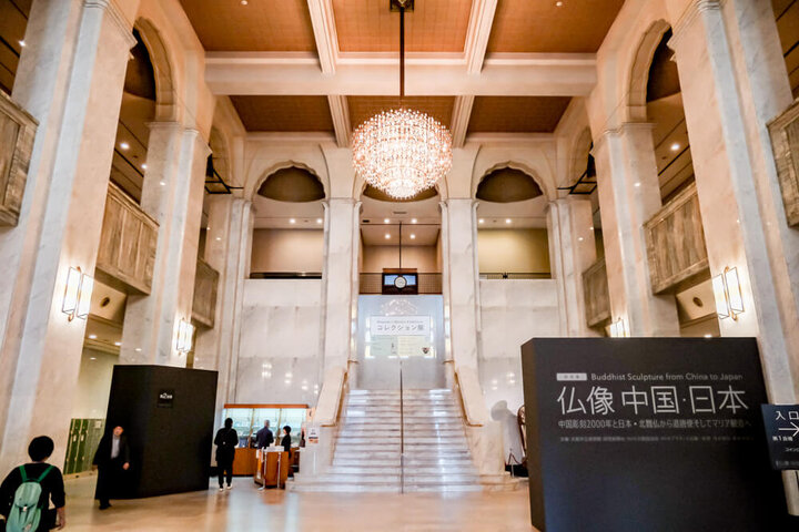 大阪市立美術館は土蔵風の近代和風建築で建てられ、2015年には登録有形文化財にも登録されました。建物は町家の蔵をイメージして作られているのだそう。一方内装は豪華なシャンデリアや大理石が使われたヨーロッパ風のデザイン。思わず写真を撮りたくなる、建築美を堪能できますよ。