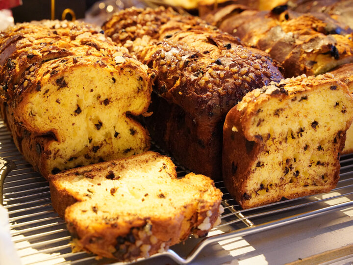 卵黄を多めに加えた風味豊かなブリオッシュは、もっちりしつつも、スポンジケーキのようにふわっと上品な口溶け。混ぜ込んだスペイン産のチョコレートのコク&甘さも広がります。上部にのせたパールシュガーのカリカリした食感もクセになるはず。