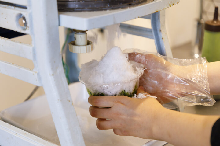 氷を削り、抹茶シロップをかける作業を3回繰り返す