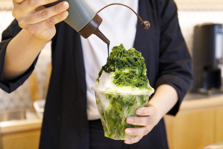 <用意するもの> 道具: ・家庭用かき氷機 ・氷 シロップ: ・抹茶 (お好みで) ・砂糖 (お好みで) ・水(お好みで) 抹茶シロップはスーパーなどでも手軽に手に入りますが、粉末状の抹茶を使って自宅でシロップをイチから作れば自分好みの味が作り出せるのでおすすめです。 お店では、濃厚な味わいの宇治抹茶「抹茶 濃茶」(1620円)と、薄めがお好みの方向けに「抹茶 薄茶」(972円)があります。「粉の量を調整すると、より濃厚、より薄めなどいろいろアレンジができます。自分好みの抹茶かき氷を見つけてみてください」と新村さん。