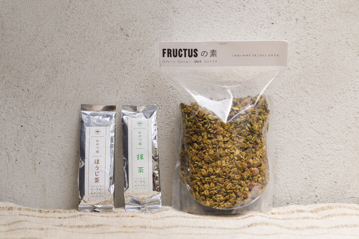 (左)「おやつ用抹茶」(648円)。(右)抹茶味のグラノーラ「FRUCTUSの素」(1479円)