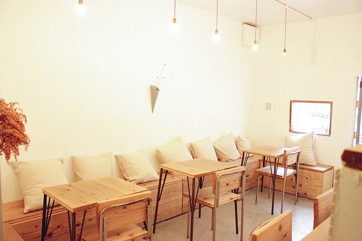 外観と同様に、お店のテーブルやイスなども全てDIYしたもの。暖色系の豆電球や木の温もり溢れる家具が素敵な店内。優しい空気が流れています。