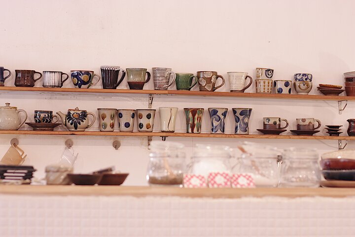 お店で使われている器は、全てお隣の雑貨屋「カモシカ雑貨店」のもの。「カモシカ雑貨店」は、全国各地の器を集めた人気店です。“やちむん”や“スリップウェア”など手仕事の温かみを感じられる器が揃っていますよ。キッチンの棚に並んでいるのは、いろんな柄や形のかわいい器ばかり。どの器で出てくるのかも楽しみですね。