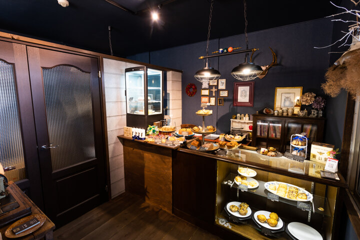 神戸・北野の坂道途中の路地にたたずむ「American Bake 青い蜂」。蜂のマークがついた白くて小さなドアを開けると、紺色の壁にアンティーク調のインテリアが映える、シックな空間が広がっています。こちらは金~月曜のみオープンする小さな焼き菓子店。スコーンやマフィンなど、食べ応えのあるアメリカンベイクを対面販売しています。