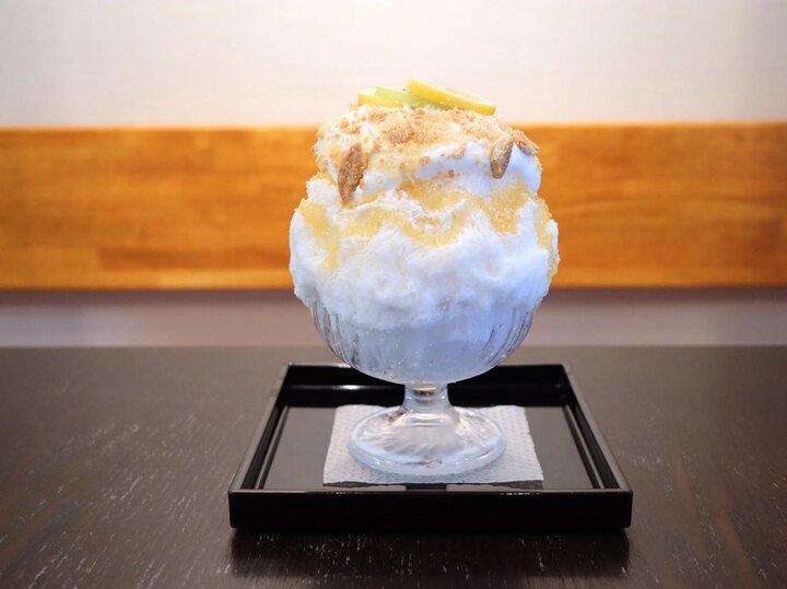 季節のかき氷「レモンブラン」は、フランス語で「白い山」を意味するモンブランと、レモンを合わせたかき氷。ケーキをイメージしたこちらは、生のレモンを煮詰めて作った自家製のレモンソースをたっぷりかけてあるのが魅力。生クリームに砕いたクッキーがアクセントに、レモンの酸味と爽やかな風味が味わえます。 食べ進めていくとグレープフルーツとレモンのジュレが隠れており、さっぱりした後味が暑い夏にぴったり。販売状況により終了する場合があるので、気になる方は早めの来店がオススメです。
