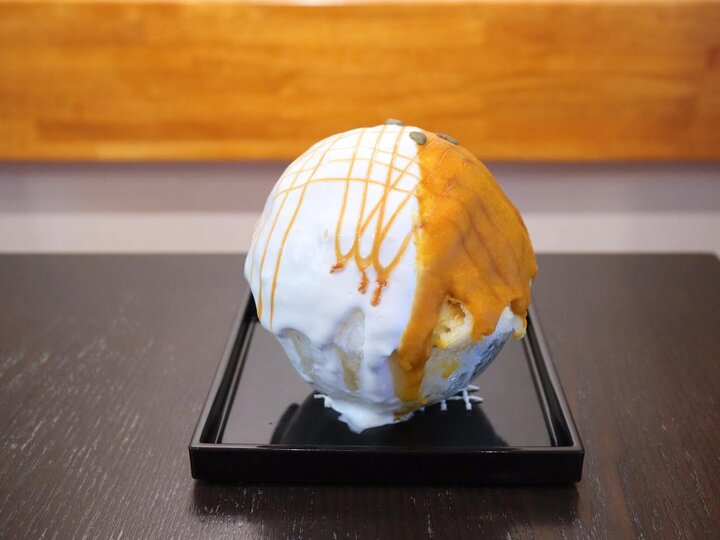 お店で一番人気の「かぼちゃん」は、北海道産のえびすかぼちゃのペーストと、北海道の生クリームをかけて、仕上げにキャラメルソースをかけたかき氷。隣のパンケーキ専門店「茶香」が、ハロウィンシーズンに販売したかぼちゃのパンケーキをモデルにしたのだそう。 表面と氷の中にも入っている、かぼちゃペーストは濃厚。ミルキーな生クリームと合わせるとまろやかな味わいに。最後までかぼちゃの味を楽しめます。こちらはハロウィンシーズン以外に、一年中食べることができますよ。