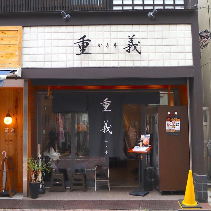 東京メトロ・北千住駅から徒歩10分。昔ながらの懐かしい下町情緒あふれる街並みを歩きながら「千住ほんちょう商店街」へ。100軒を連ねる飲食店が並ぶその一角で営業するのが、かき氷専門店「重義」です。このお店は、隣接する人気パンケーキ専門店「茶香」が営むお店。 どこか懐かしさが感じられる和モダンな店内は、元々は呉服屋さんを改装したのだそう。10席ほど並ぶテーブルや椅子で、落ち着いた雰囲気の中、かき氷を楽しめます。 一見かき氷店とは想像できない個性的な店名は、オーナーの中村誠さんのご両親の名前から1文字ずつ取って名付けたのだそう。そんな「重義」では、季節限定から定番まで魅力的なかき氷が一年中楽しめます。