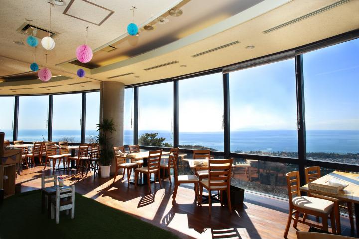 小高い丘陵にある湘南平へは、JR平塚駅から車で約22分。湘南平と平塚の“平”の文字と、“フラッと気軽に寄りたくなるレストラン”をコンセプトに名付けらた「フラット」。壁一面の大きなパノラマ窓からは、湘南の青い海、春には桜が咲き誇る風景が眼下に広がります。