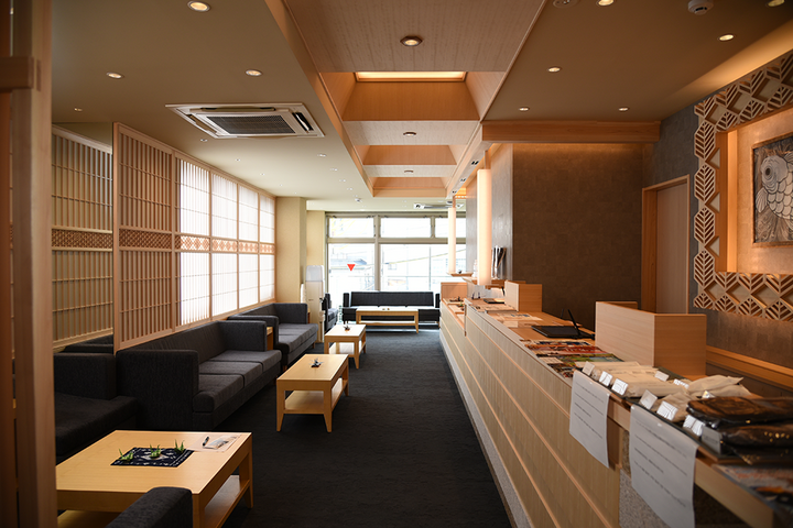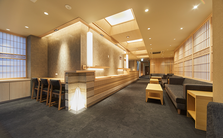 柔らかな灯りに照らされた心地よい空間(フロント・共用休憩エリア)