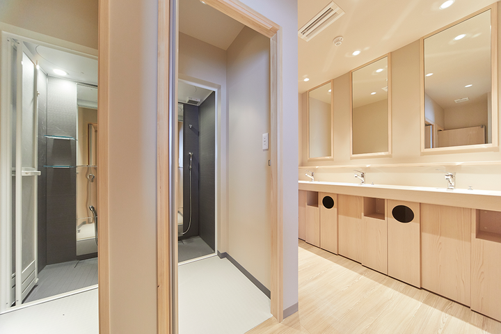 やはり木のしつらえにこだわった、清潔感あふれるシャワールーム(4F・男性専用)