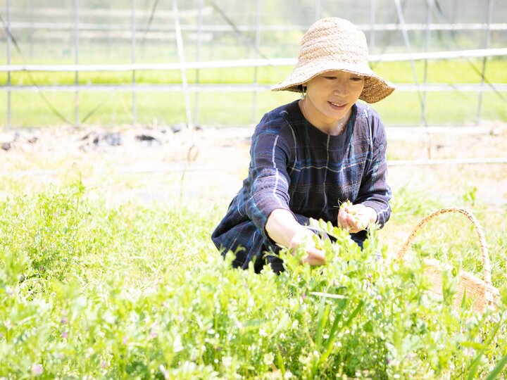 農園に自生するハーブを摘むYaeさん。ゲストに摘んでもらうこともあるそう