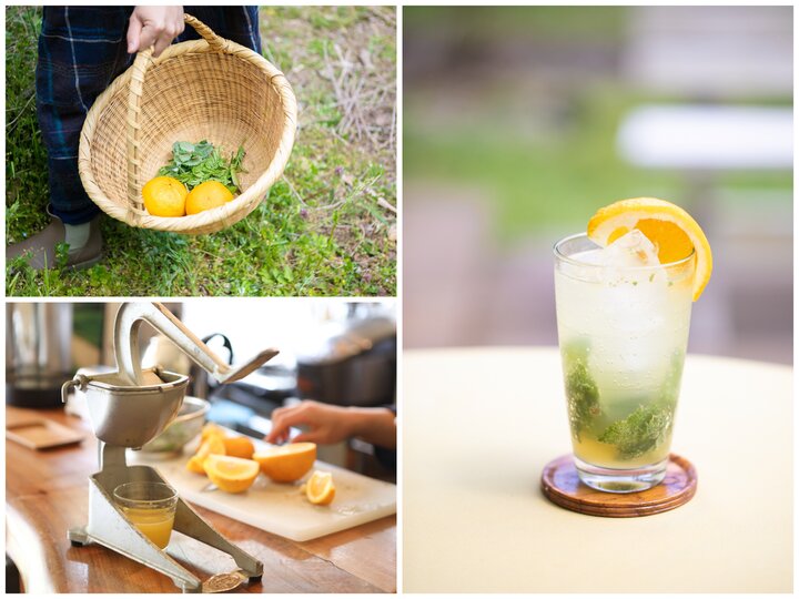 昔ながらの風光明媚な棚田風景が広がる鴨川の名勝「大山千枚田」のすぐ近く。山の斜面に広がる棚田を横目にしながら、途中途中に立てられた小さな看板を目印に進むとあらわれる「cafe En」。農薬や化学肥料を使わずに野菜や米を栽培し、農レジャーイベントなども開かれる鴨川自然王国内にあります。 出迎えてくれたのは、ここに暮らし王国を運営するシンガーソングライターのYaeさん。おさんぽがてらに収穫した夏みかんとミントで、暑い日にぴったりの夏みかんのモヒートを作ってくれました。おばあさまから受け継がれたというジューサーで、その時飲む分だけをギュッ。爽やかな香りが口いっぱいに広がります。