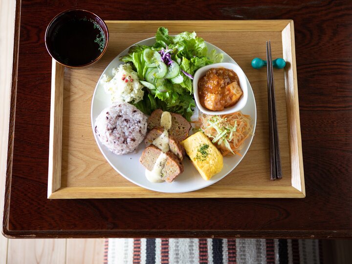 「KOZUKA513」は、里山に建つ築100年超の古民家をリノベーションしたカフェ。鴨川市の「金束513番地」にあるのがその名の由来です。オーナーは、この地に惹かれ、川崎から移住した工藤統さん、畑沢謙一さん。おふたりが、手作りの料理やスイーツでもてなしてくれます。 地産地消を大切に、食材はできる限り地元産のものを使用。裏の畑で育てている自家栽培の旬野菜も取り入れたボリュームたっぷりのランチを味わえます。人気は、6種の惣菜と黒米ご飯を盛り付けてスープをセットにしたランチプレート。惣菜は和洋中を問わず、バラエティ豊かに用意されています。
