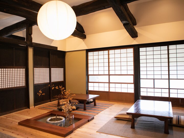 囲炉裏がしつらえられた小上がりの食事スペース。柱や梁などは古民家のものをそのまま活かした