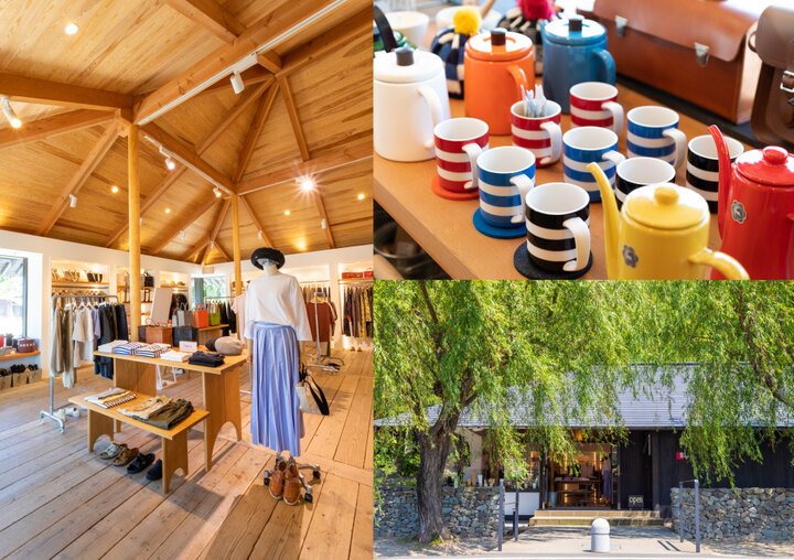 左/柱や梁が美しく、ゆったり居心地のいい店内 右上/使い心地の良さと洗練されたデザインを兼ね備えたキッチンツールも扱う 右下/周囲の自然に溶け込む建物