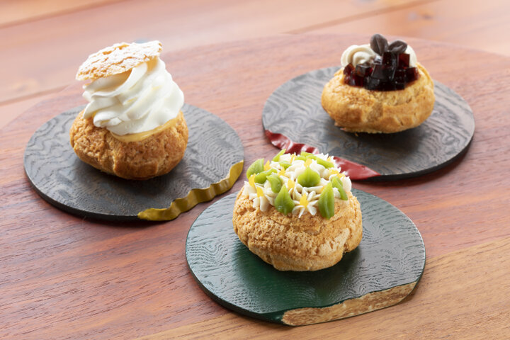 シュークリームは定番の6種類に加えて、旬のフルーツを使った季節限定のものも登場します。 定番の「カスタード」は、幅広い世代から人気のシュークリーム。香りがよく風味豊かなタヒチ種のバニラビーンズを使用したカスタードクリームは濃厚な味わいです。たっぷりとのった生クリームは、カスタードクリームの濃厚さをやわらげてくれます。シンプルながらこだわりの詰まった一品です。 「抹茶」は、花のように飾られた白あんや抹茶あんがかわいらしい和風のシュークリーム。宇治にある「丸久小山園」の上質な抹茶を使用したクリームは、甘さ控えめで濃厚な味わいが広がります。 「珈琲」は、「Okaffe kyoto」の深煎りの「ダンディブレンド」を使用したコーヒークリームが中に入っており、深みのある香りが広がります。夏季はさわやかなコーヒーゼリーがトッピングされていますが、夏季以外はコーヒー風味のフォンダンがかかっています。