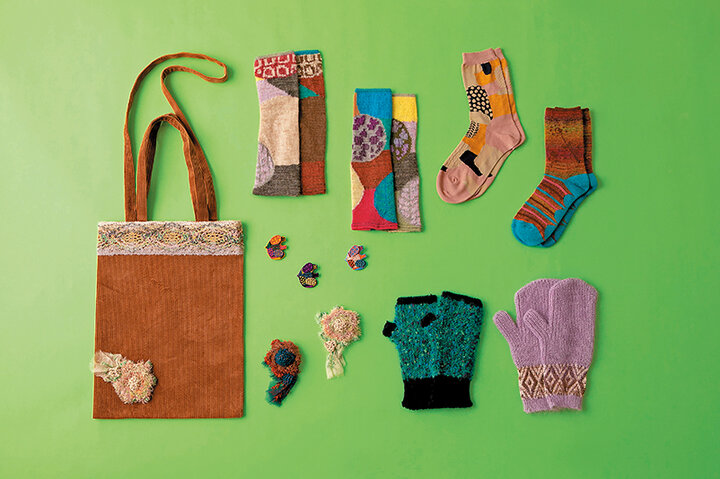 「M.&KYOKO」は、ニットの生産が盛んな山形県寒河江市に本社を構える佐藤繊維のオリジナルブランド。色とりどりの糸を紡ぎ、つなぎ合わせて、遊び心あふれるテキスタイルを生み出しています。手元や足元など1カ所に取り入れるもよし、組み合わせるもよし。大人かわいいコーディネートを楽しんで。